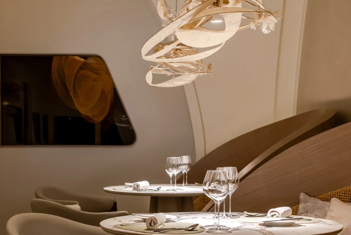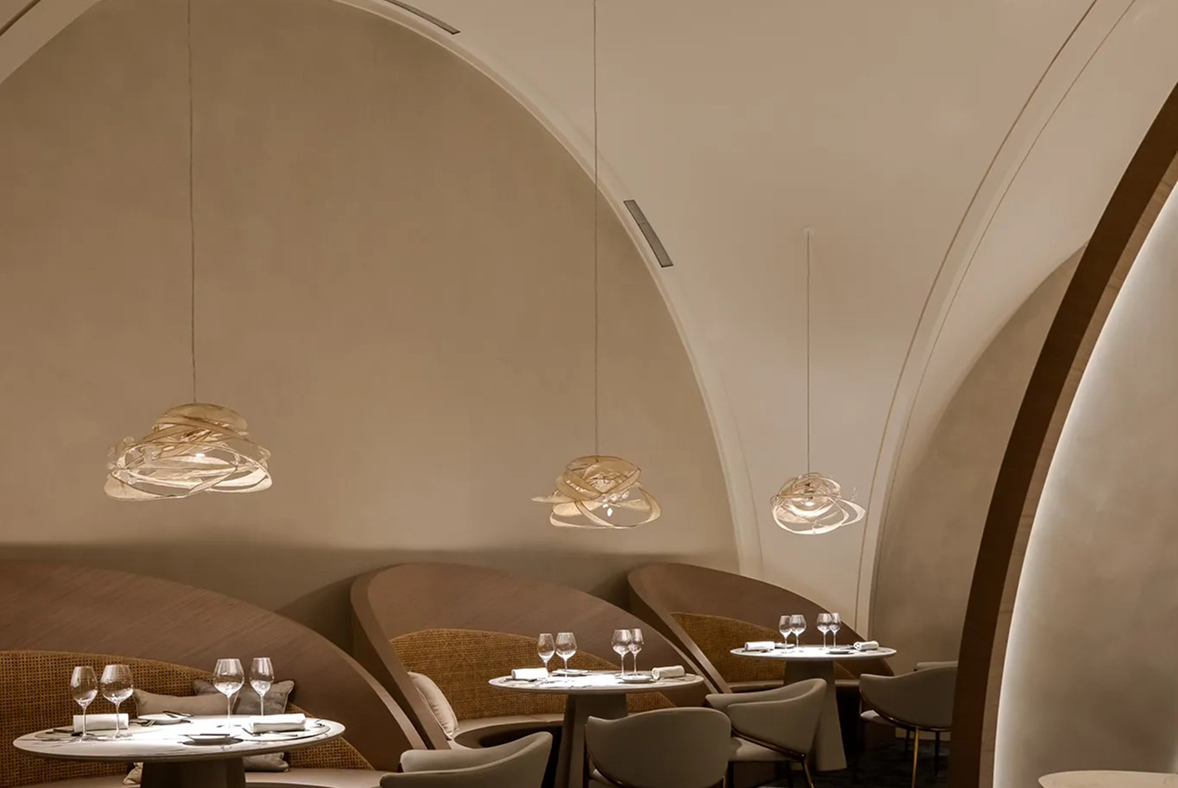 Restoranın 198 metrekarelik açık planı, suyun akışını anımsatan dairesel bir dolaşım düzenine kavuştu. Misafirleri mekânın kalbine doğru yönlendiren bu akış, yemeği sadece bir tat deneyimi olmaktan çıkararak mekânın ruhunu hissettiren bir yolculuğa dönüştürüyor. İç mekânda öne çıkan kavisli heykeller, gündüz doğal ışığı süzerek, gece ise iç aydınlatmayla zarif bir atmosfer yaratıyor.