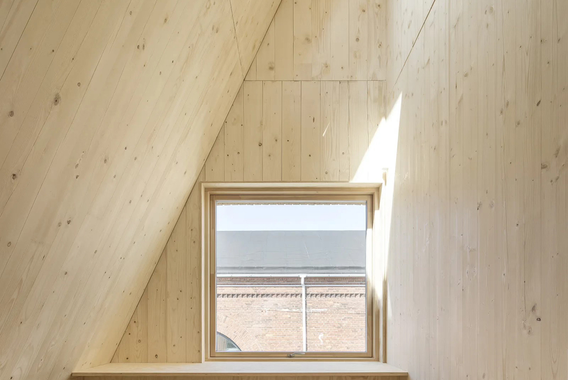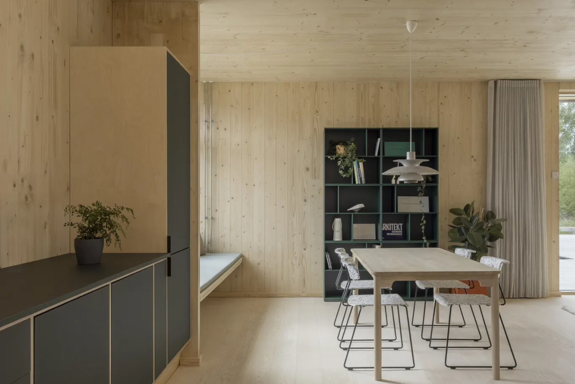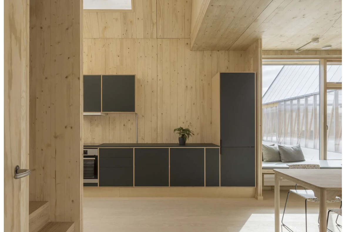 2023’te bir pencere üreticisinin girişimiyle başlayan proje, Jernbanebyen bölgesinde uzun, dar bir arsada konumlanan iki örnek konut ve dört yarı açık pavilyondan oluşuyor. Ahşap mimariyle inşa edilen iki ev, sürdürülebilirlik ilkeleriyle tasarlanmış; biri masif ahşap ve doğal havalandırma, diğeri ise CLT ve hibrit (doğal/mekanik) havalandırma sistemiyle çalışıyor. Her ikisinde de kullanıcıya güneşlikleri ve pencereleri kontrol etme imkânı veren akıllı sistemler bulunuyor. İçeride açık renk ahşap kaplamalar, yüksek tavanlar, sade detaylar ve kuzeyin yalın estetiği hâkim. Dışarıda, ahşap bir platformla birbirine bağlanan yapılar, sebze bahçesini de içeren küçük bir yerleşim hissi yaratıyor; konuklar bu bahçeden ürün toplayıp yemeklerinde kullanabiliyor.