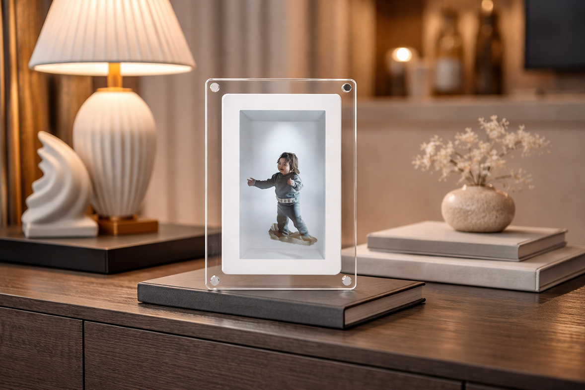 Kullanım süreci de sade tutulmuş. İçerik dönüştürüldükten sonra cihaz, USB-C bağlantısı aracılığıyla bilgisayara bağlanarak görsellerin doğrudan aktarılmasına olanak tanıyor. Bu içerikler daha sonra çerçeve üzerinde döngüsel olarak sergilenebiliyor. Yaklaşık bin hologram depolayabilen ve 30 saniyeye kadar video içeriklerini destekleyen bu yapı, deneyimi teknik bir gösteriden çok, gündelik kullanımın parçası hâline getirmeyi hedefliyor.