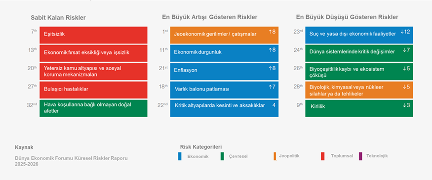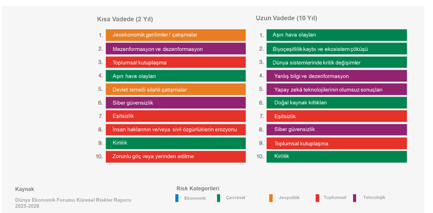 Bu yıl 21'incisi yayımlanan raporda kısa vadeli risk algısının, daha çok insan kaynaklı ve yönetişim temelli tehditler etrafında yoğunlaştığını söyleyebiliriz. Jeoekonomik gerilimler ve çatışmalar, mezenformasyon ve dezenformasyon ile toplumsal kutuplaşma, önümüzdeki iki yıl için en yüksek şiddete sahip riskler arasında yer almaktadır. Kısa vadede risk algısının bu yönde şekillenmesi, küresel sistemde artan belirsizlik, güven erozyonu ve kırılgan yönetişim yapılarının etkisini yansıtmaktadır.